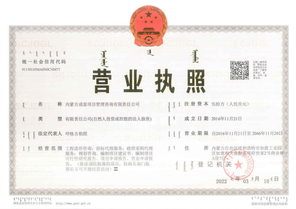 內蒙古成套項目管理咨詢有限責任公司營業執(zhí)照